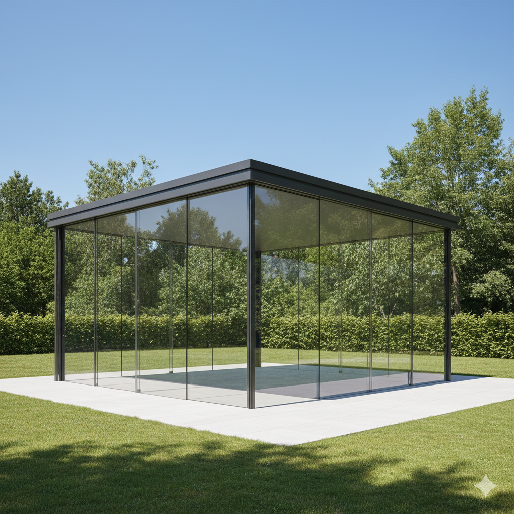 Minimalista, 4x4 méteres üvegterasz, prémium alumínium kerettel, ideális lakossági és üzleti felhasználásra.