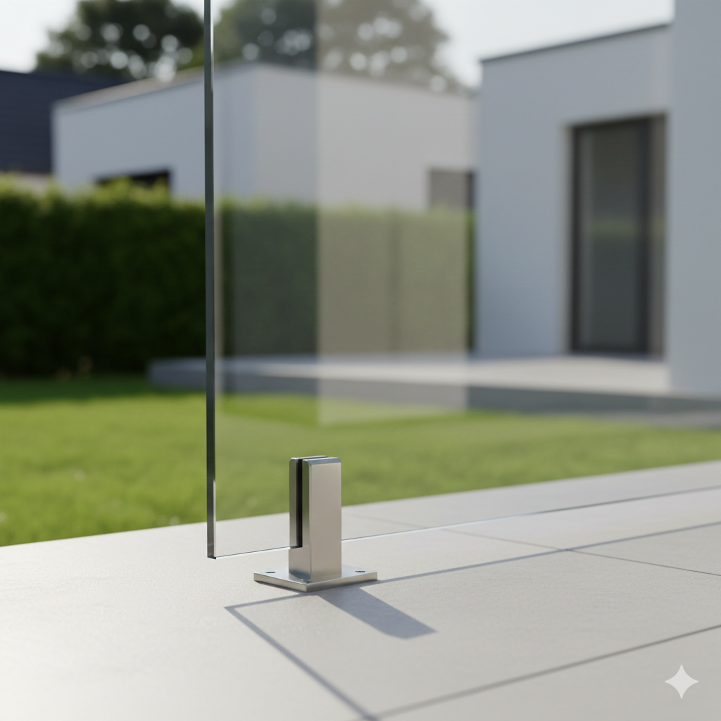 Vékony profilú, elegáns üvegkorlát oszlop, prémium anyagból, modern minimalista stílusban, kültéri és beltéri használatra.