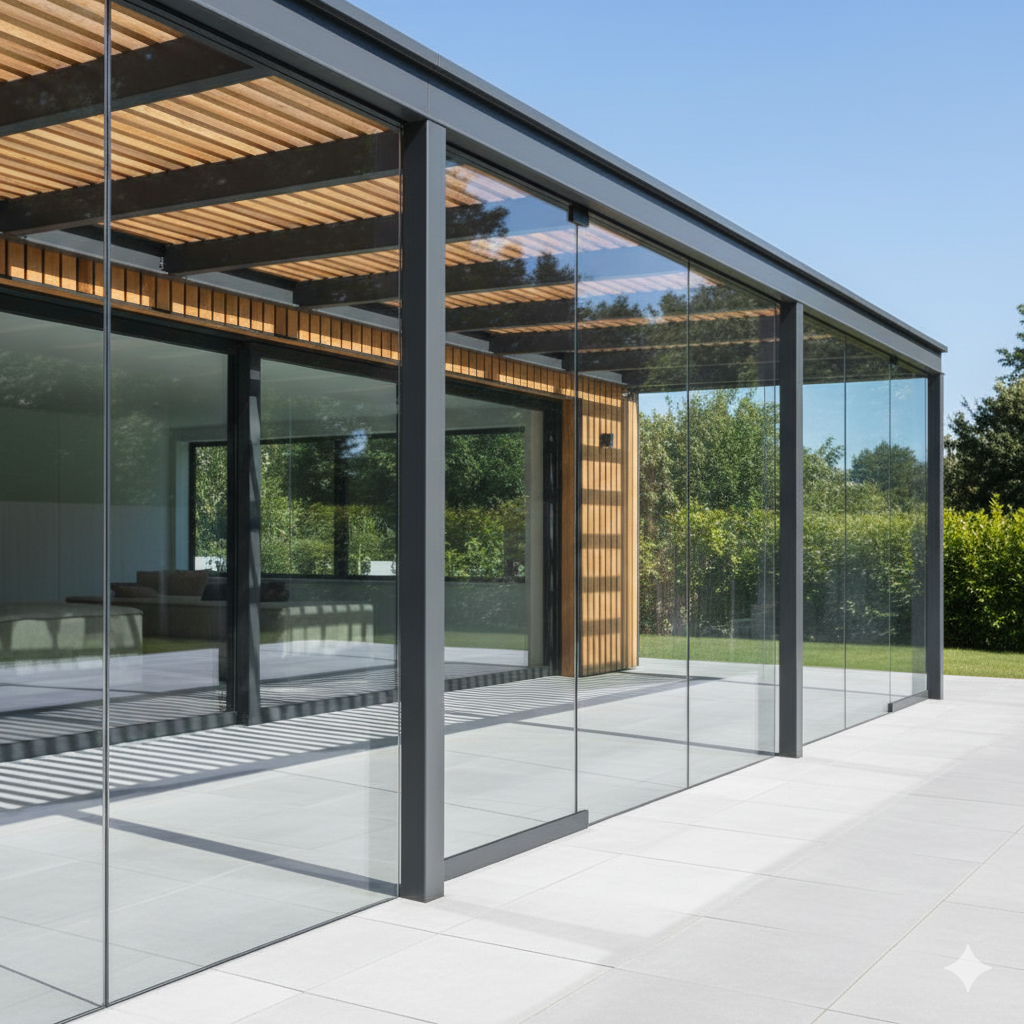 Minimalista, 4x4 méteres üvegterasz, prémium alumínium kerettel, ideális lakossági és üzleti felhasználásra.
